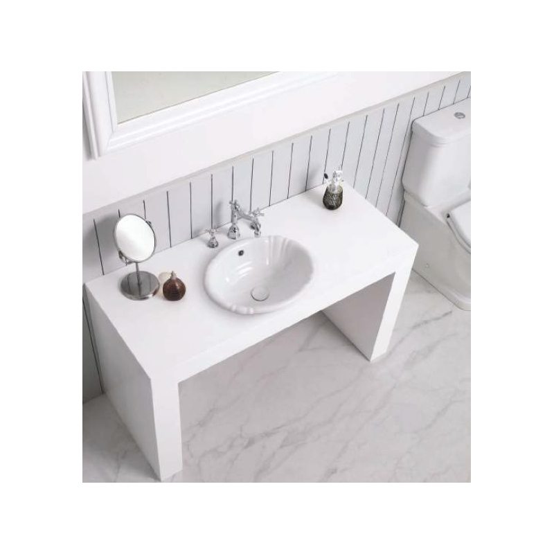 Eleganza senza tempo per il lavabo da incasso soprapiano con la decorazione in rilievo sul bordo, un classico per i bagni di ogni dimensione.
