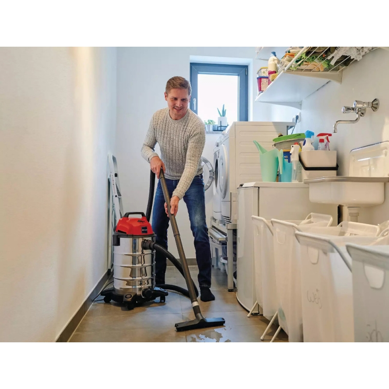 L’aspiratore di solidi e liquidi TC-VC 1930 S è uno strumento indispensabile che risponde ai requisiti più elevati per lavori di pulizia in casa, in officina e in garage. Il serbatoio in acciaio inossidabile da 30 litri raccoglie sporco e liquidi che possono poi essere smaltiti rapidamente e comodamente tramite la vite di scarico dell’acqua. È previsto anche un pratico attacco di soffiaggio. L'aspiratore TC-VC 1930 S è dotato di un tubo flessibile di aspirazione lungo 2,5 m, un tubo rigido di aspirazione in plastica composto da tre elementi, una grande bocchetta di aspirazione con accessorio combinato per aspirare solidi e liquidi dal pavimento e una bocchetta per giunzioni. Per l’aspirazione di polvere e trucioli entra in gioco il filtro a pieghe, mentre per aspirare i liquidi il filtro in espanso protegge il motore dalle impurità. Grazie al supporto di fissaggio per il cavo e al supporto per gli accessori, tutti i componenti possono essere sistemati rapidamente e ordinatamente. L’impugnatura di trasporto e le quattro rotelle orientabili ne agevolano la mobilità e la manovra.