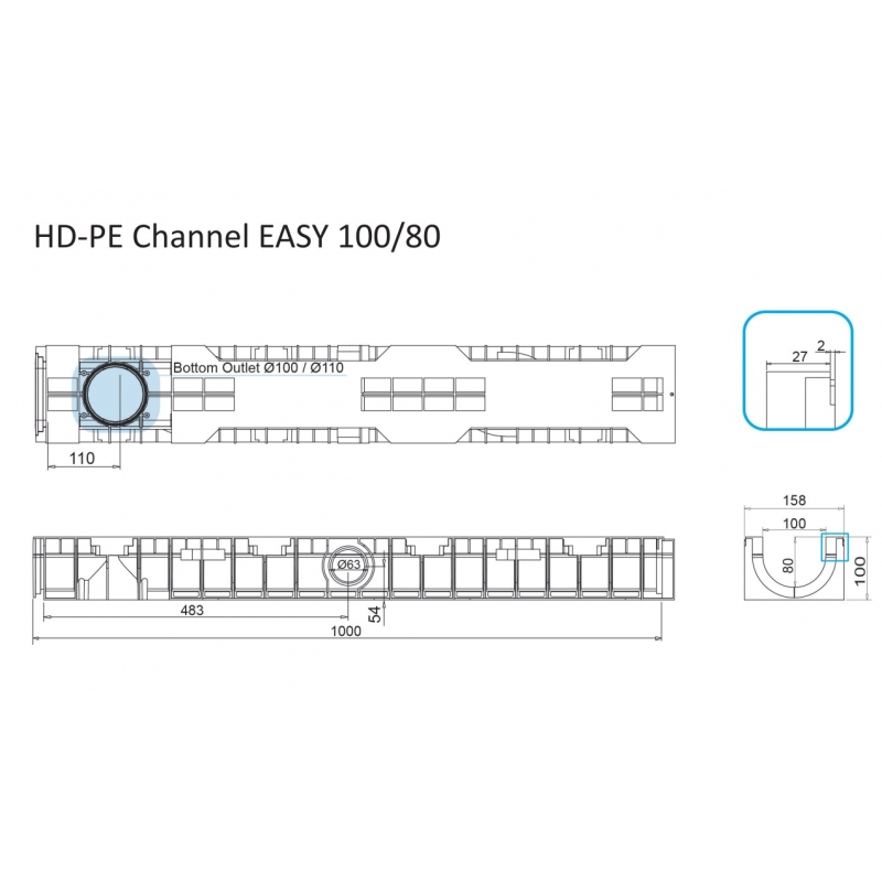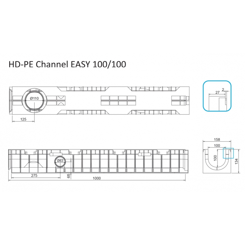 CANALETTA EASY 100 IN POLIETILENE PE-HD CLASSE C250 EN1433 LUNGHEZZA MT 1 LARGHEZZA ESTERNA MM 158 INTERNA MM 100