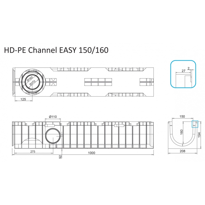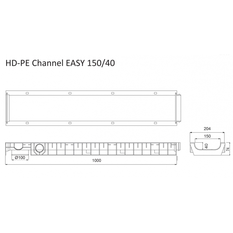 CANALETTA EASY 150 IN POLIETILENE PE-HD CLASSE C250 EN1433 LUNGHEZZA MT 1 LARGHEZZA ESTERNA MM 208 INTERNA MM 150