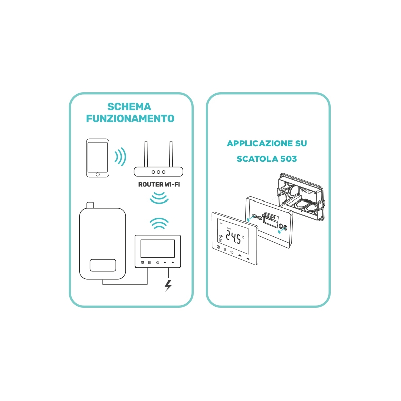 La configurazione è semplice e rapida ma lascia che sia un professionista a installare il cronotermostato wi-f. Dopodichè scarica e installa l'App Homcloud sullo smartphone e segui le inidicazioni. Per maggiori informazioni visita www.homcloud.com/support o leggi il manuale di istruzioni all'interno della scatola.