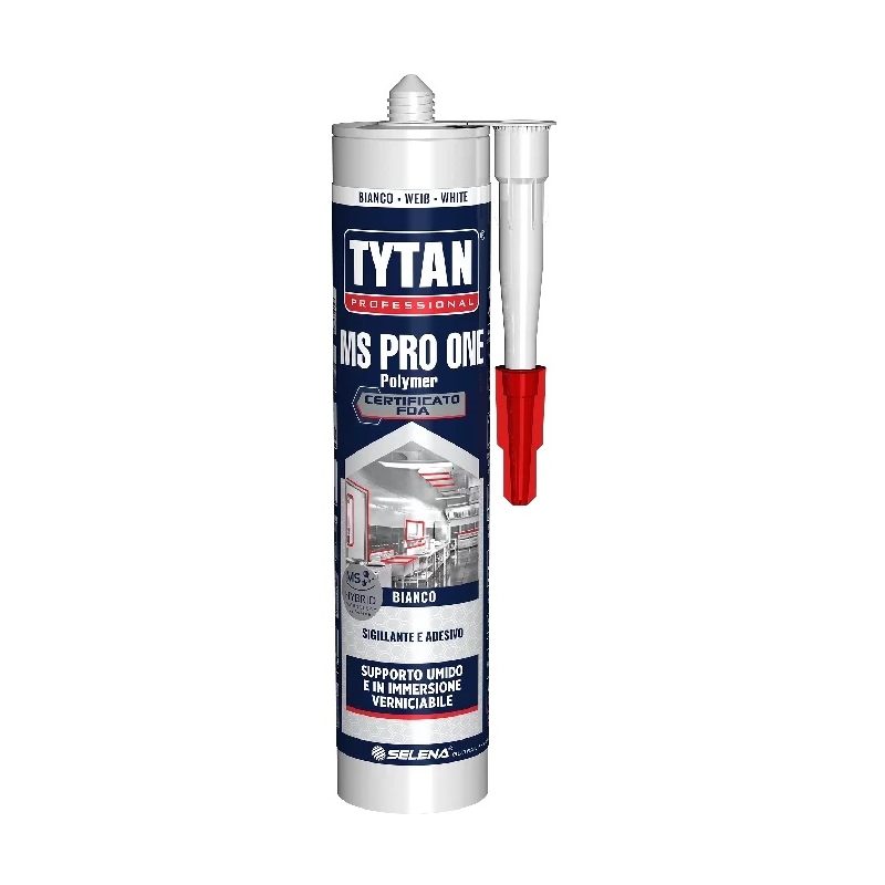 Tytan Professional Ms Pro One è un sigillante adesivo, elastomerico monocomponente, a base di polimero MS, che reticola a temperatura ambiente a contatto con l’umidità dell’aria. Prodotto estremamente versatile adatto sia alle applicazioni con materiali pesanti che leggeri. Utilizzabile su superfici umide ed in immersione. Nelle colorazioni bianco e grigio, il prodotto è approvato dall’FDA per il contatto indiretto con alimenti.