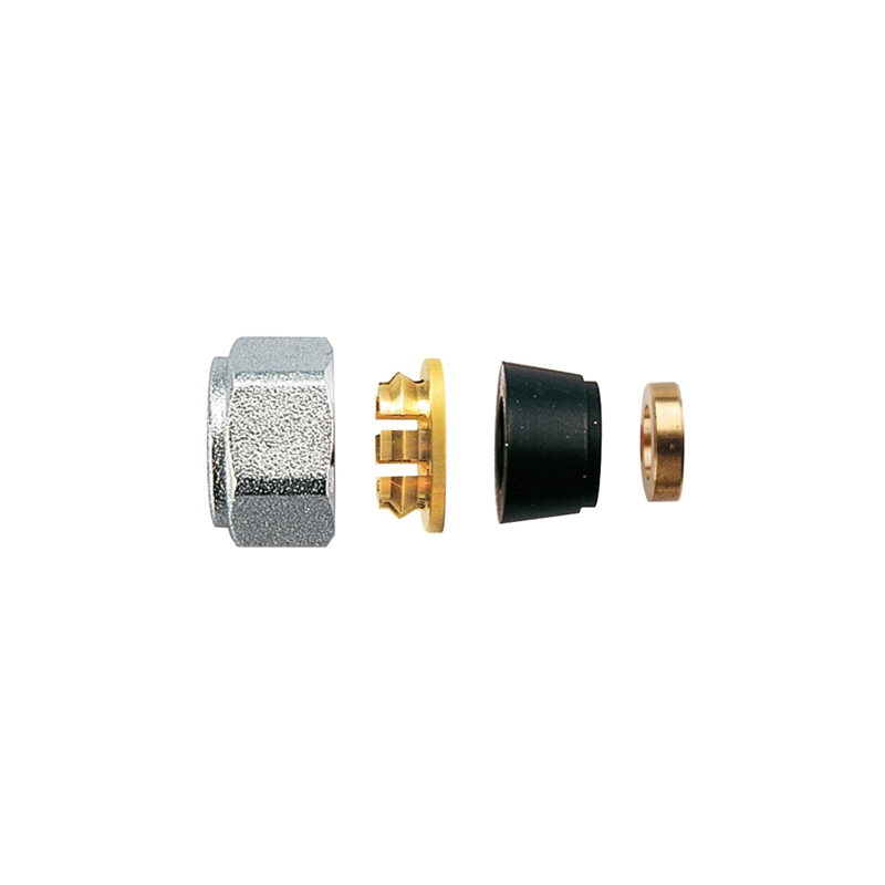 Kit di tenuta in gomma a compressione per tubo rame, composto da: ranella guidatubo in ottone, monocono in gomma, anello stringitubo in ottone, calotta in ottone cromato con filetto 24x19