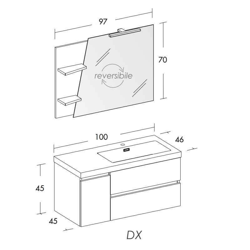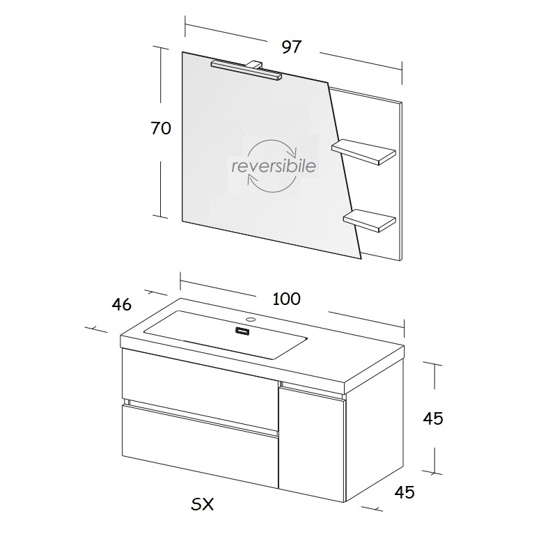 Nr. 1 Base porta lavabo con 2 cassetti e 1 anta 100x45x45 (L X P X H)