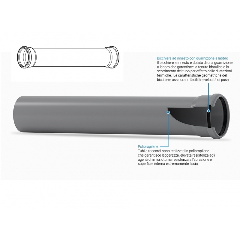 Caratteristiche del tubo: Interno bianco, resistente agli urti, autoestinguente è il nuovo tubo in Polipropilene ad innesto per lo scarico di acque civili e industriali che si integra perfettamente con la linea di raccordi.