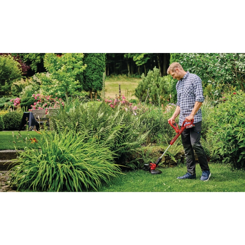 Il tagliabordi a batteria GE-CT 18/30 Li-Solo di Einhell garantisce prati perfetti. Bordi, superfici, angoli e contorni non rappresentano alcun problema: questo utensile senza cavi arriva dappertutto, anche grazie alla regolazione telescopica dell'asta dell'impugnatura di guida, mentre l'impugnatura supplementare e la superficie antiscivolo offrono comfort e maneggevolezza. La testa del motore ruota di 90° per lavorare su superfici verticali o sui bordi. Le rotelle di guida consentono di lavorare anche sui bordi. Il tagliabordi ha anche 3 livelli di inclinazione per la massima flessibilità quando si lavora sotto cespugli o altri ostacoli. La protezione per fiori e piante evita danni accidentali. È inclusa una bobina (5 m) con testina automatica a pressione facilmente sostituibile quando necessario. Il tagliabordi funziona con batterie Power X-Change da 18 V. Tutte le batterie di questa serie sono intercambiabili. La fornitura non comprende batteria e caricabatteria, che devono essere acquistati separatamente, ad esempio con il pratico Starter Kit.