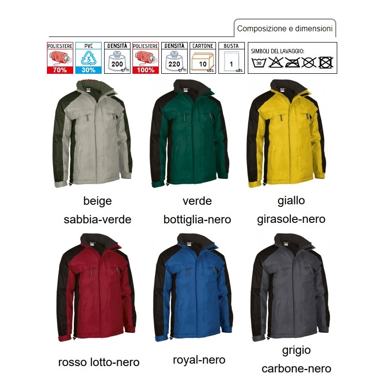 Trattamento impermeabile. Imbottitura 100% poliestere 220 gr/m2.