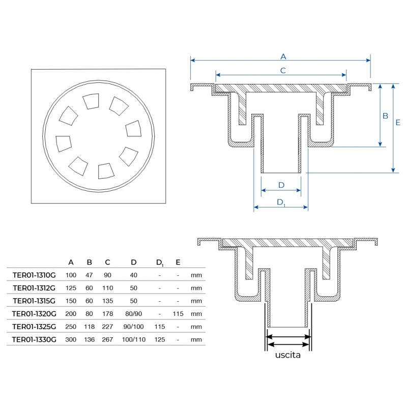 Disponibile nelle dimensioni 100x100 e 150x150 mm con telaio + griglia inox, 100x100, 125x125, 150x150, 200x200, 250x250 e 300x300mm