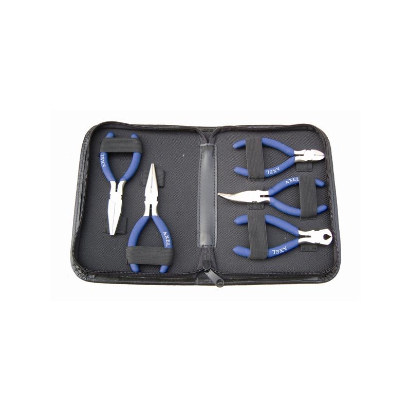 Confezione: 1 tronchese taglio centrale, 1 tronchese taglio laterale, 1 pinza becchi piegati, 1 pinza becchi tondi, 1 pinza becchi piatti