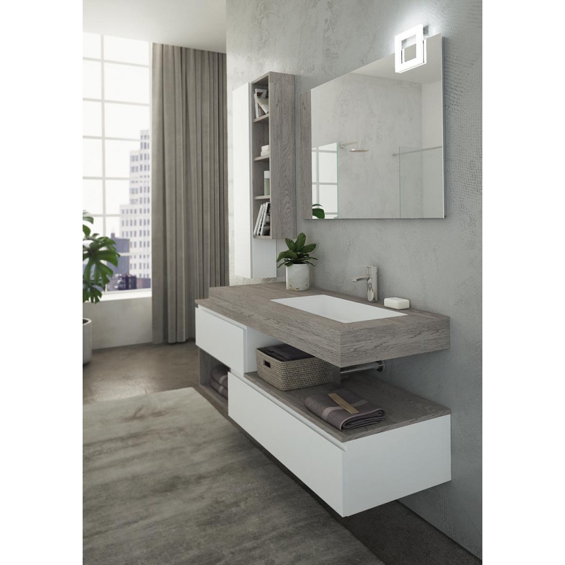 Base e pensili con finitura Laccato Bianco Opaco e Rovere Gessato Grigio. Specchio a filo lucido con lampada a led "Quadra" . Top veletta Ocritech in laminato HPL Rovere Gessato Grigio con vasca integrata bianca Opaca.